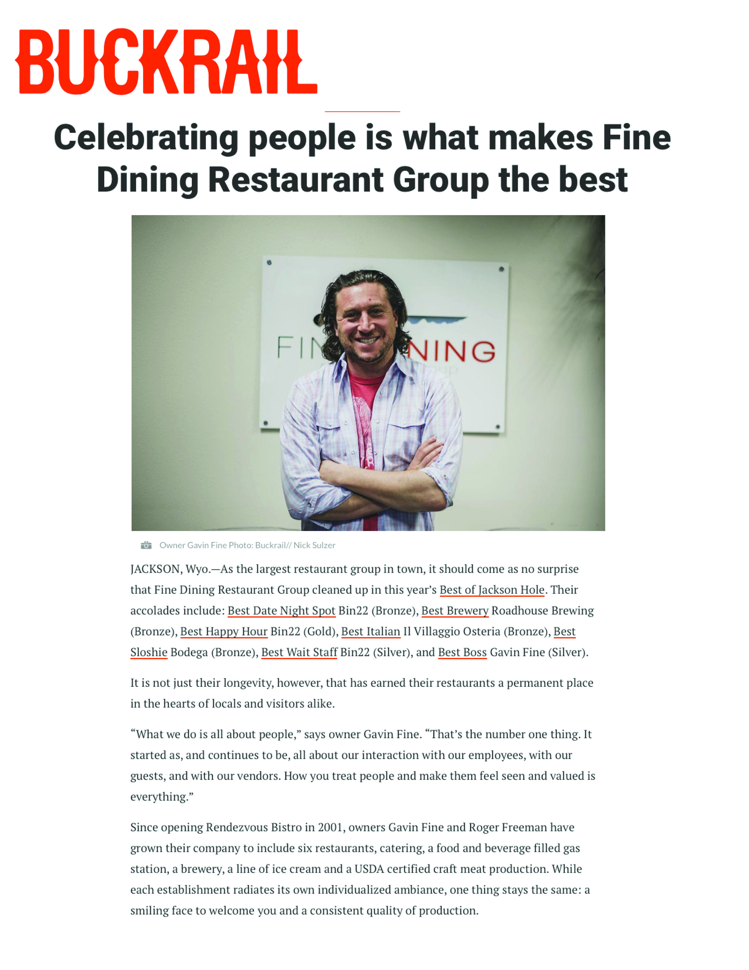 Buckrail highlights Fine Dining Restaurant Group’s strong showing in its annual Best of Jackson Hole awards, recognizing multiple restaurants and team members across categories ranging from Best Happy Hour and Best Italian to Best Brewery and Best Wait Staff. The feature also spotlights founder Gavin Fine, named Best Boss, and underscores the people-first philosophy that has guided Fine Dining Restaurant Group’s growth and lasting impact on the Jackson Hole community.